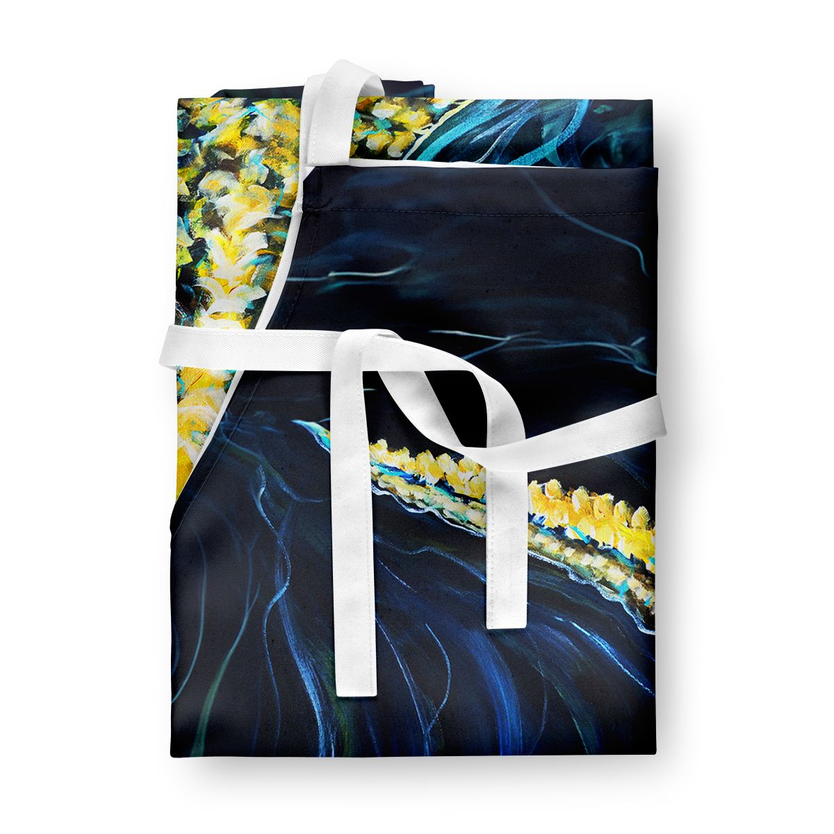 Elevate your cooking, baking, and grilling experiences with our versatile Kitchen or BBQ Apron. This Bib Style apron isn't just limited to culinary activities - it also serves as an excellent baking apron, artist apron, server apron, gardening apron, or even a dog grooming apron. The apron showcases vibrant full-color artwork contributed by one of our talented artists, bringing a dash of style to your daily tasks. With dimensions of approximately 27"W x 30"H, it provides ample coverage to protect your clothing from spills and splashes. Our apron is meticulously crafted from 100% Ultra Spun Polyester, known for its durability and lightweight nature. The apron comes with white tie straps, ensuring a comfortable and adjustable fit for all. It's a perfect choice for kitchen apron enthusiasts, whether you are a woman or a man. Designed for easy maintenance, this apron is fully machine washable. The quick-drying polyester material actively reduces staining, keeping your apron looking fresh and new for longer. Our beautifully designed apron isn't just a functional kitchen accessory - it's a fashion statement in the culinary world!