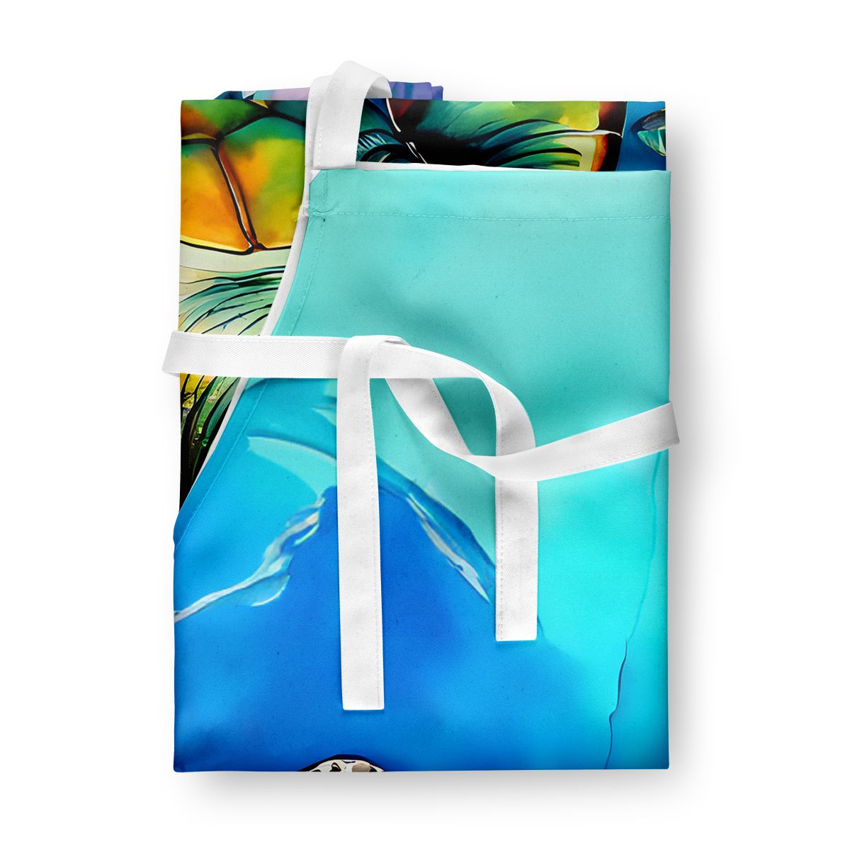 Apron featuring breed specific Loggerhead Sea Turtle artwork. Elevate your cooking, baking, and grilling experiences with our versatile Kitchen or BBQ Apron. This Bib Style apron isn't just limited to culinary activities - it also serves as an excellent baking apron, artist apron, server apron, gardening apron, or even a dog grooming apron. The apron showcases vibrant full-color artwork contributed by one of our talented artists, bringing a dash of style to your daily tasks. With dimensions of approximately 27"W x 30"H, it provides ample coverage to protect your clothing from spills and splashes. Our apron is meticulously crafted from 100% Ultra Spun Polyester, known for its durability and lightweight nature. The apron comes with white tie straps, ensuring a comfortable and adjustable fit for all. It's a perfect choice for kitchen apron enthusiasts, whether you are a woman or a man. Designed for easy maintenance, this apron is fully machine washable. The quick-drying polyester material actively reduces staining, keeping your apron looking fresh and new for longer. Our beautifully designed apron isn't just a functional kitchen accessory - it's a fashion statement in the culinary world!